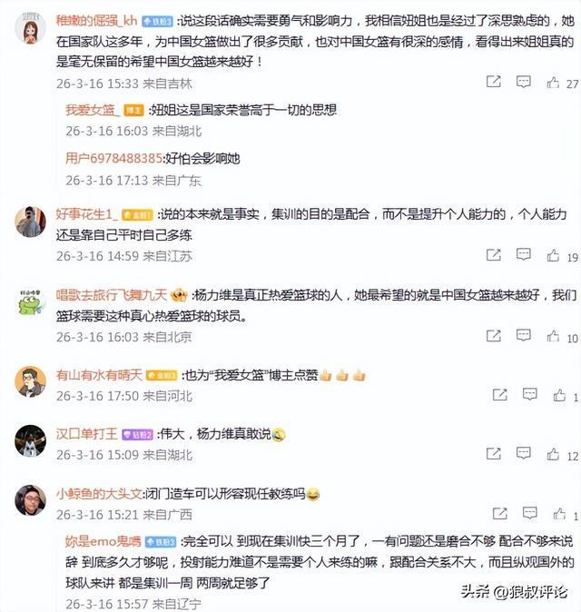 随后,媒体人“我爱女篮”发文点评:总要有人说,总要有人做,杨力维这番言论无疑是有风险的,因为可能会动一些人的蛋糕。但我爱女篮认为,杨力维这是真正希望中国女篮越来越好才仗义执言。纵观全球体坛,职业化程度较高的足球和篮球,运动员都是在高水平的俱乐部比赛和提高,欧冠和NBA(WNBA)的商业价值早就超越大部分国家队比赛。每逢国际比赛日,球员再从俱乐部征召到国家队,但最长集训时间不超过两周,而我们总是与国际潮流背道而驰。